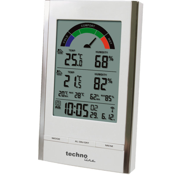 The Technoline WS 9480 is a modern weather station with a sleek, white and chrome design. It features a wireless outdoor sensor that transmits data to the indoor unit, providing you with accurate readings of both the indoor and outdoor temperature and humidity. The WS 9480 also includes a number of other features, such as a color-coded comfort indicator, a 24-hour min/max history, and a snooze alarm.